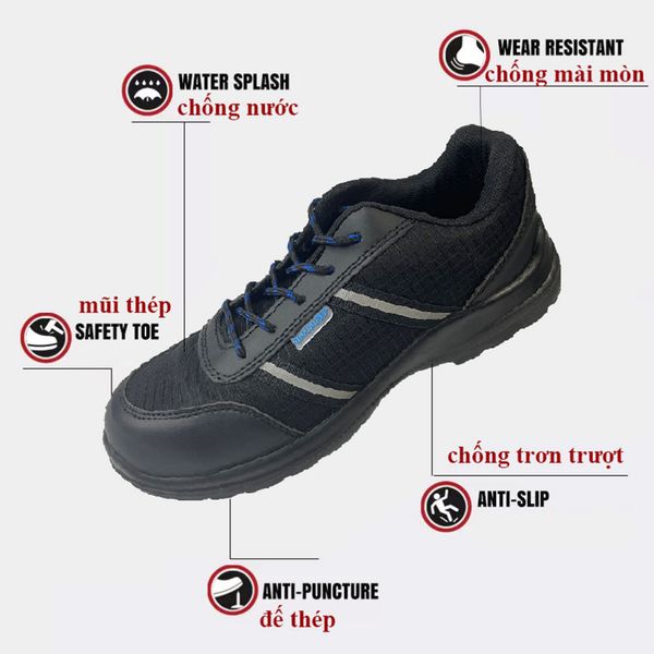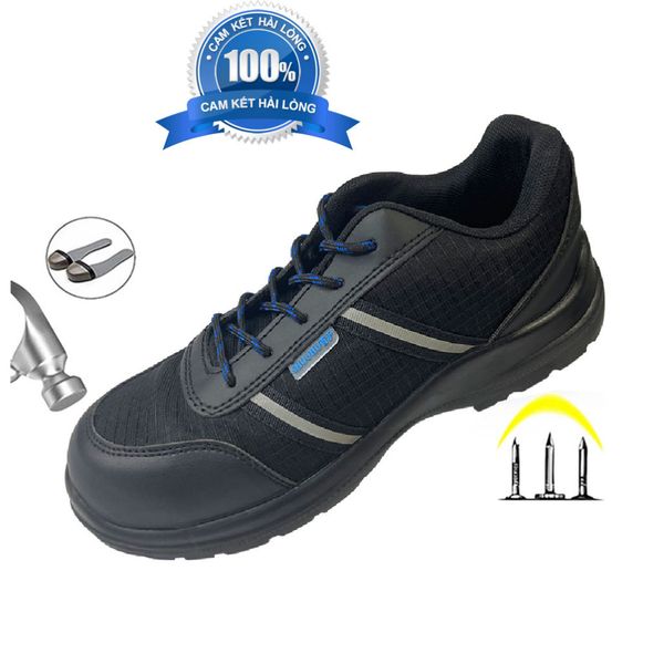Mũi giày và phần lót đế: có tăng cường lớp thép chống va đập ngón và chống đâm xuyên. Nó được làm theo tiêu chuẩn của EU. Đảm bảo thoải mái và an toàn khi lao động.
